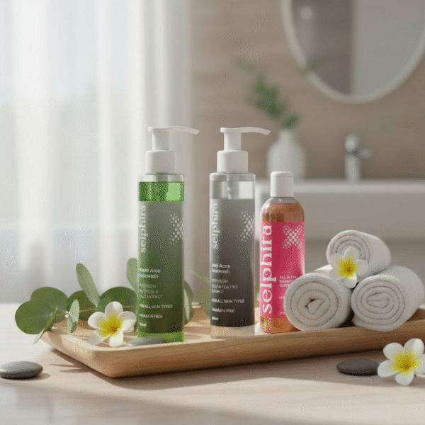 This set features three Selphira essentials: Neem Aloe Facewash, Anti Acne Purifying Facewash, and All-In-One Shampoo with Conditioner. The Neem Aloe Facewash combines neem, aloe vera, and tulsi extract to gently purify and hydrate, making it ideal for all skin types and paraben-free. The Anti Acne Facewash works to fight blemishes and purify the skin with natural extracts, while the All-In-One Shampoo and Conditioner provides comprehensive hair care in one bottle. This versatile kit ensures complete daily cleansing and care for both hair and all skin types, promoting a healthy, refreshed look from head to toe.